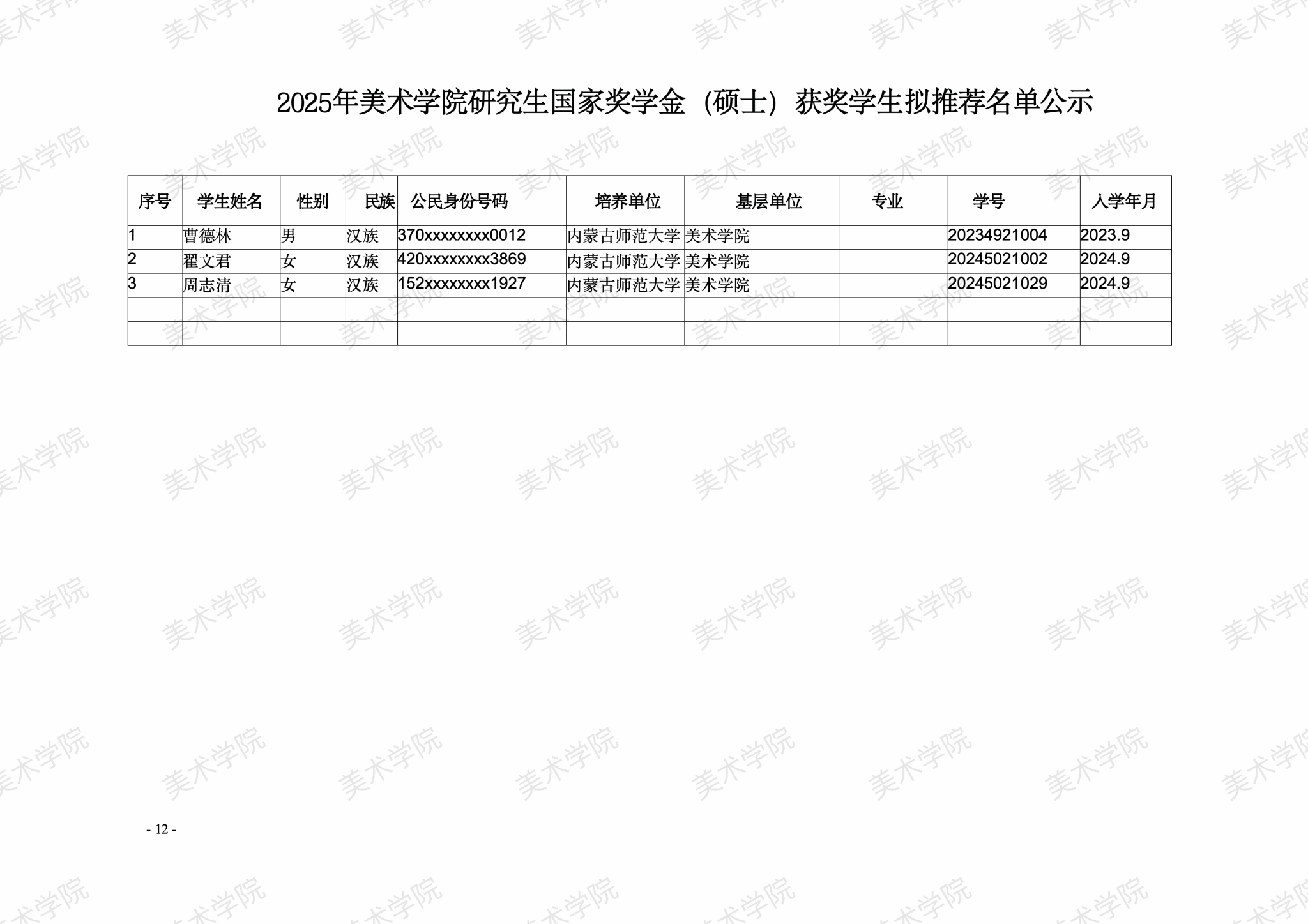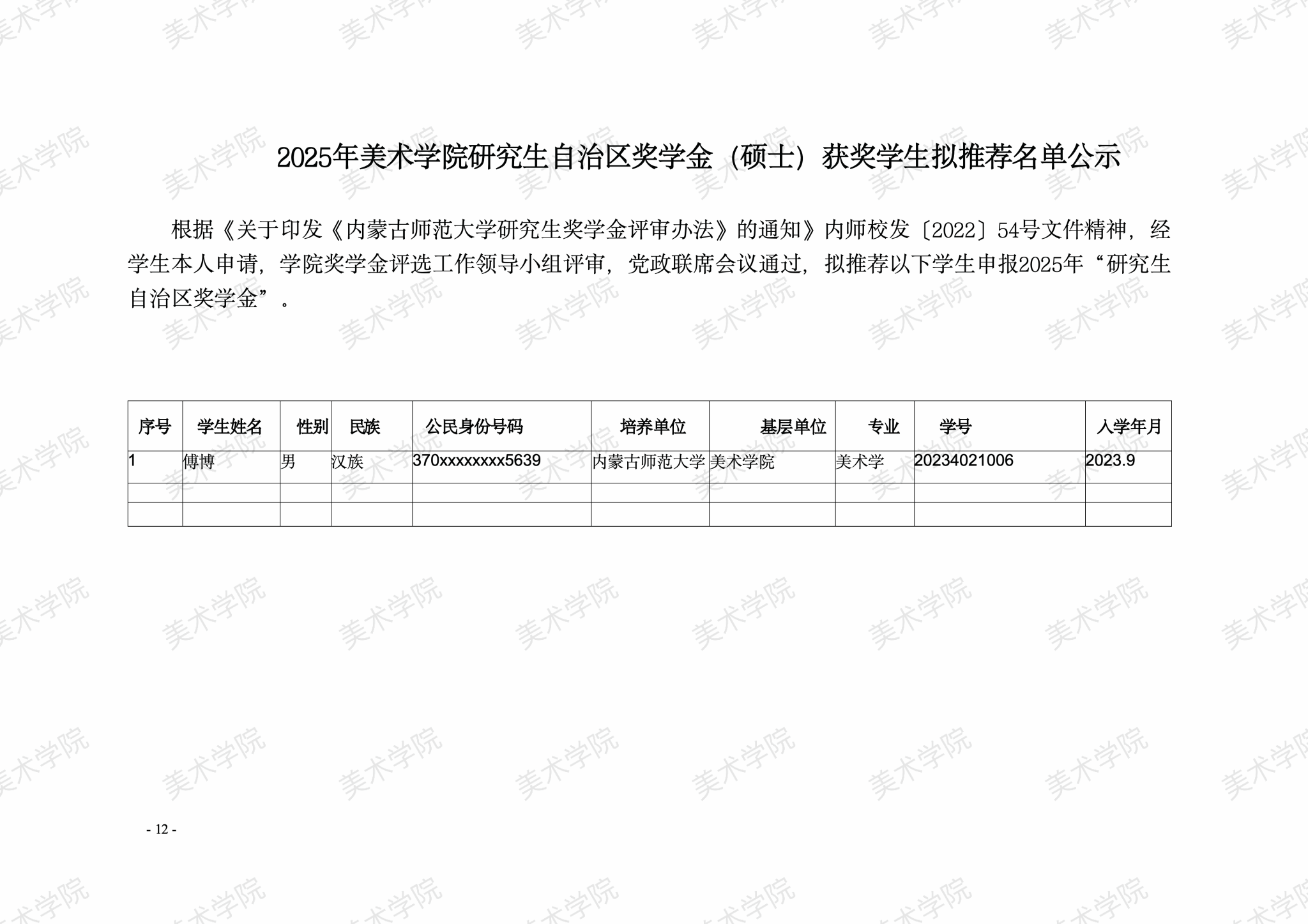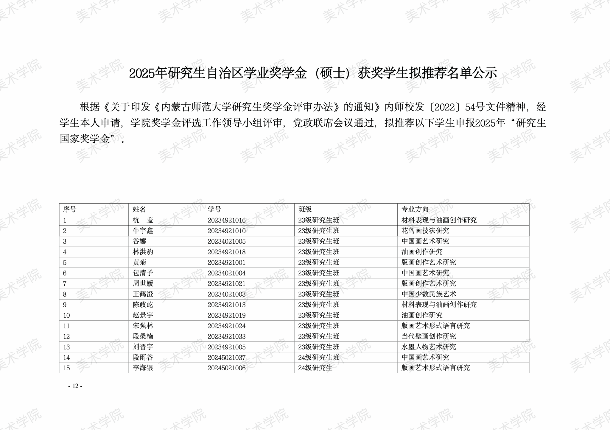 奖学金评选工作领导小组评审,党政联席会议通过,拟推荐以下学生申报2025年“研究生国家奖学金”“研究生自治区奖学金”“研究生学业奖学金”。